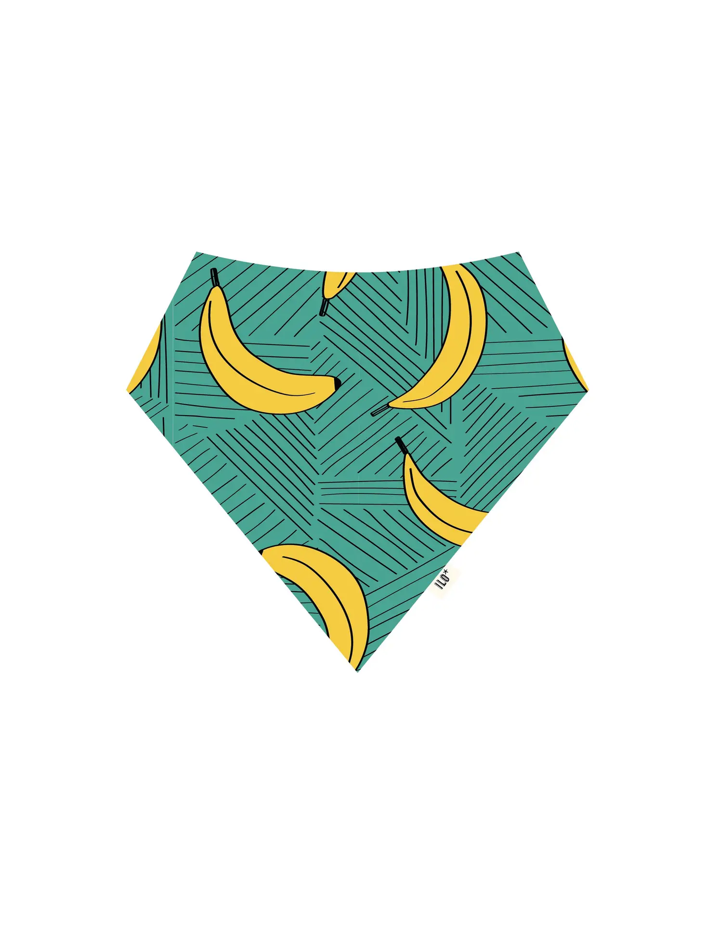 Brighten up babies outfit with this colourful bandana bib with its bright and cheerful bananas on turquoise print, on the reverse side there is a contrasting striped print.