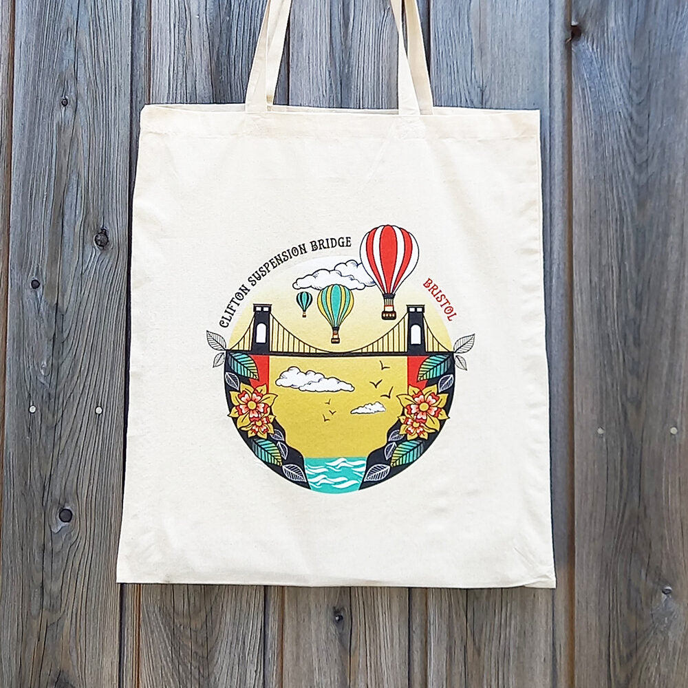 Natural heavy cotton long handled tote bag celebrating the Suspension bridge. Measures 38cm x 43cm