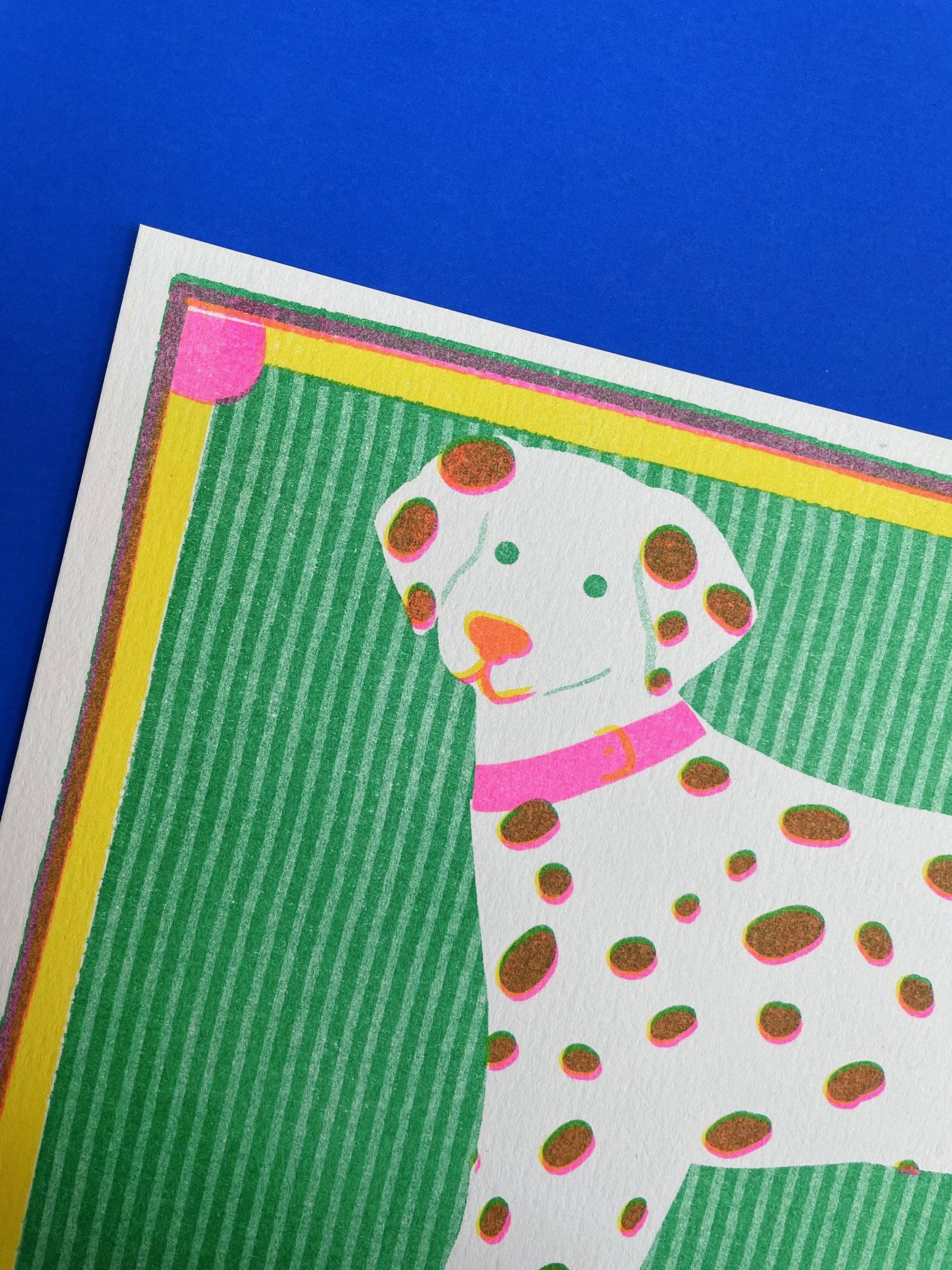 Risograph print featuring a sweet Dalmatian printed in the using soy based environmentally friendly inks on recycled paper stock