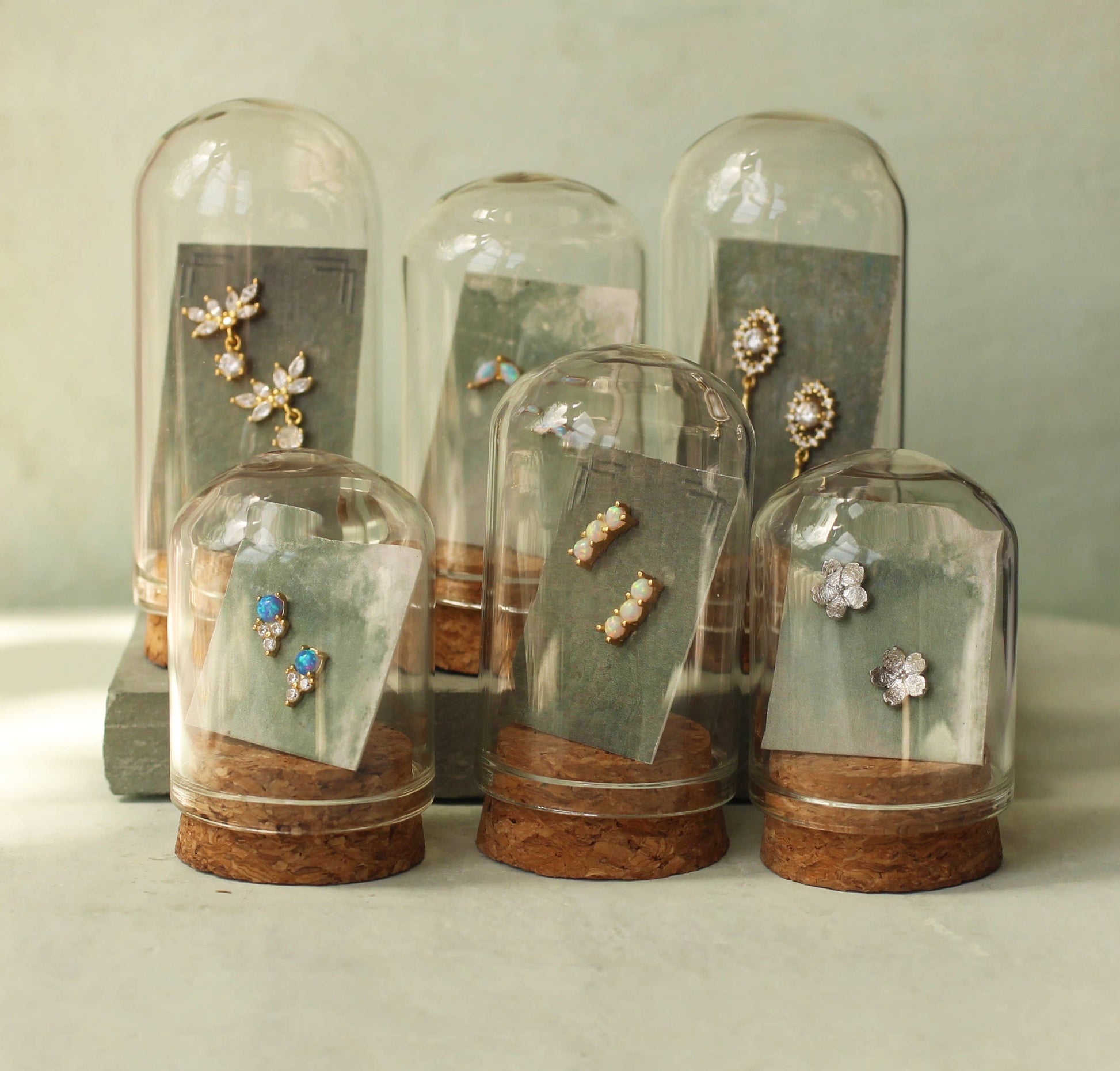 These stud earrings come mounted on a linen presentation card. You also have the option of adding a well crafted glass presentation cloche. They transform the earrings into tiny historical specimens, and make a beautiful and engaging gift idea.
