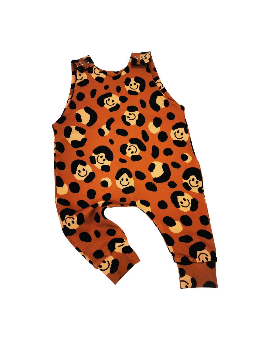This House of Margaux organic cotton leopard print romper is decorated all-over with smiley face on leopard print, with two metal press buttons on the shoulders for easy dressing. These rompers are designed for all year round wear.