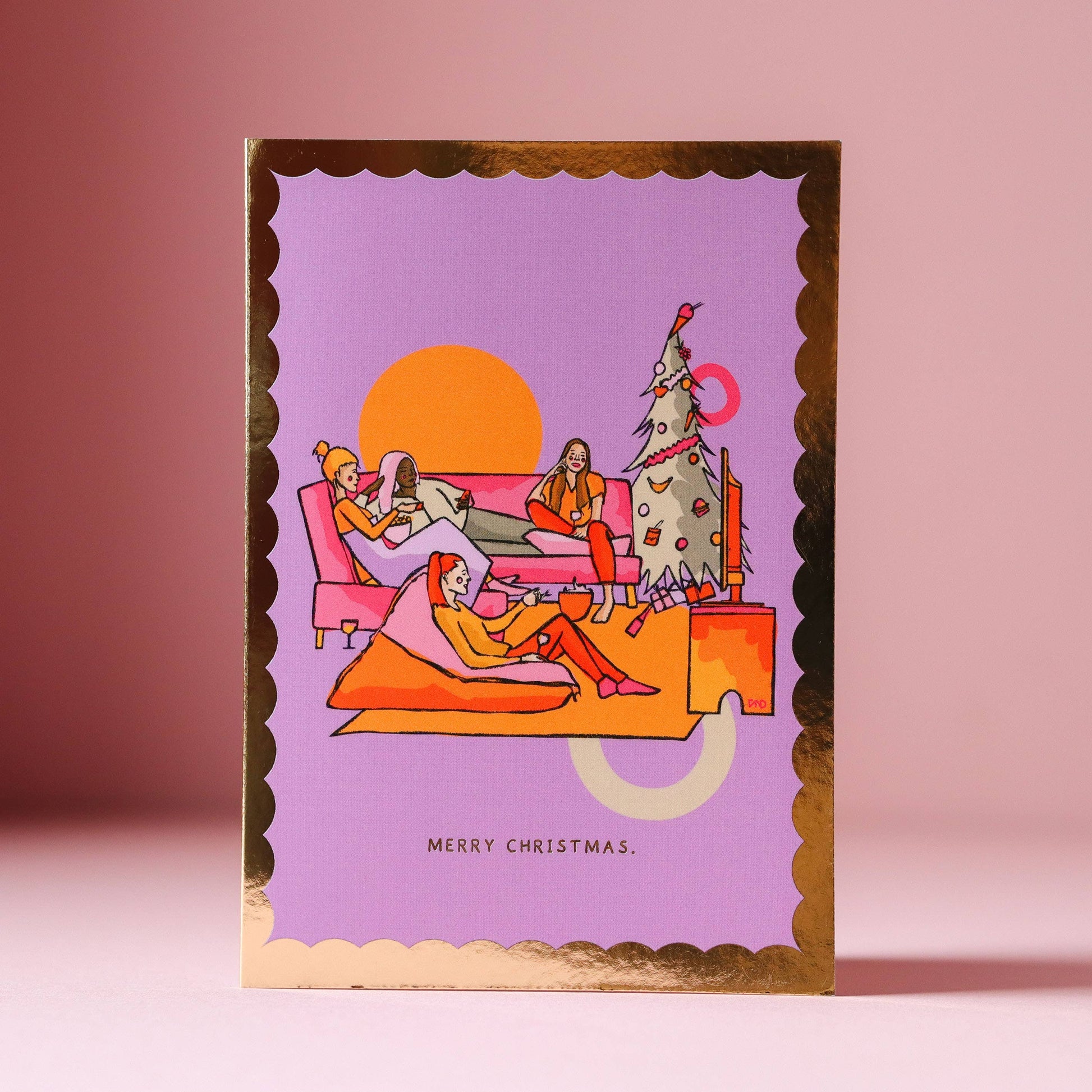 This colourful greeting card features my original artwork of a Christmas movie night. Illustrated in purple, pink, and orange with a gold foil scalloped border and text.