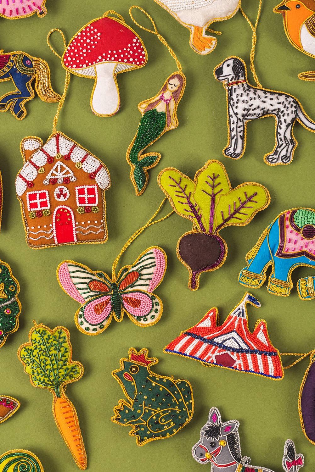 Our pretty butterfly decoration is adorned in soft colours and delicate patterns; celebrate these stunning creatures with this beautiful decoration. This piece has been decorated with intricate metal embroidery and glass beads to create a charming design. Made in India using cotton fabric and filled with recycled plastic, this lovely decoration is perfect for your festive tree, or all year round.