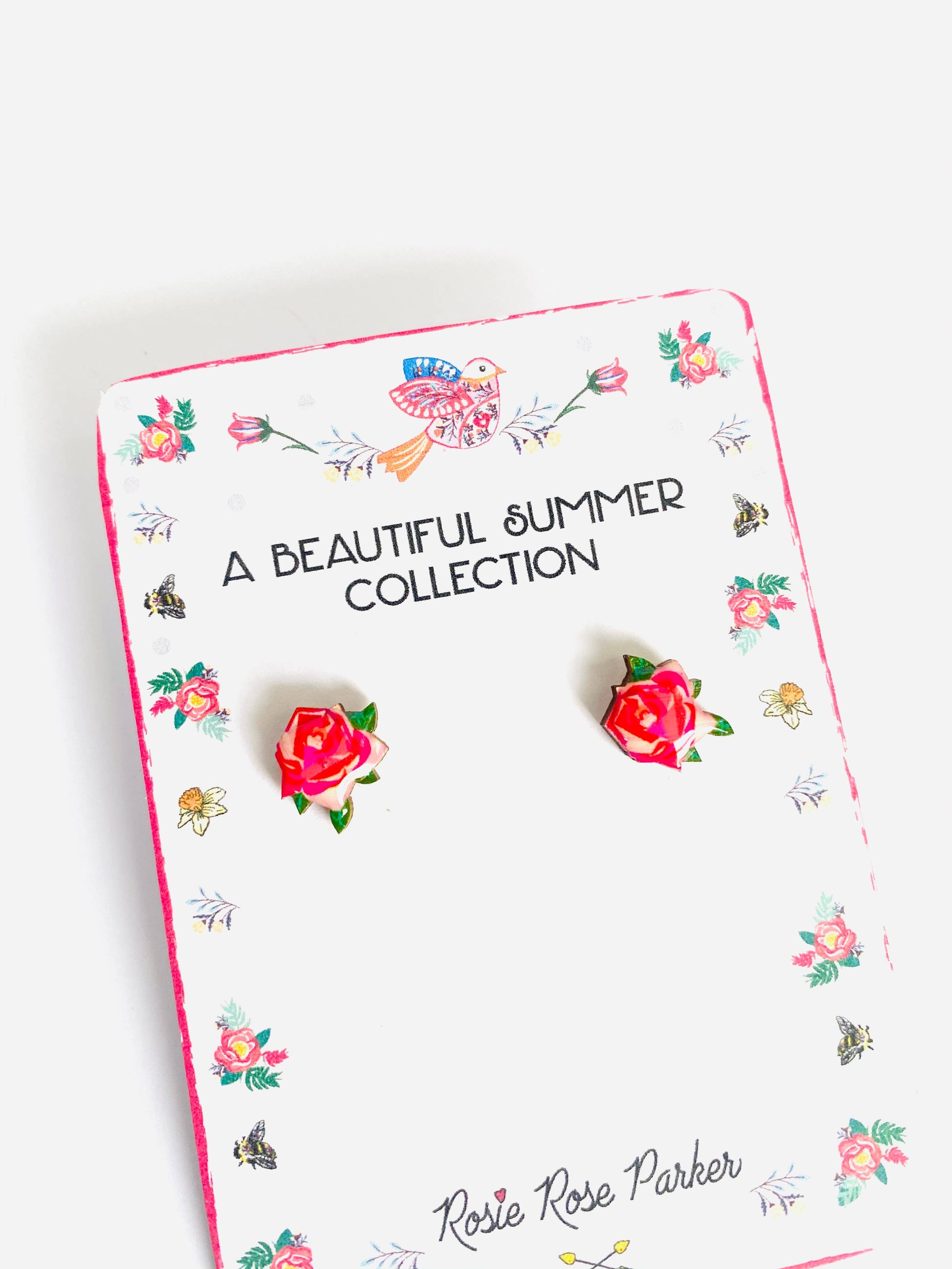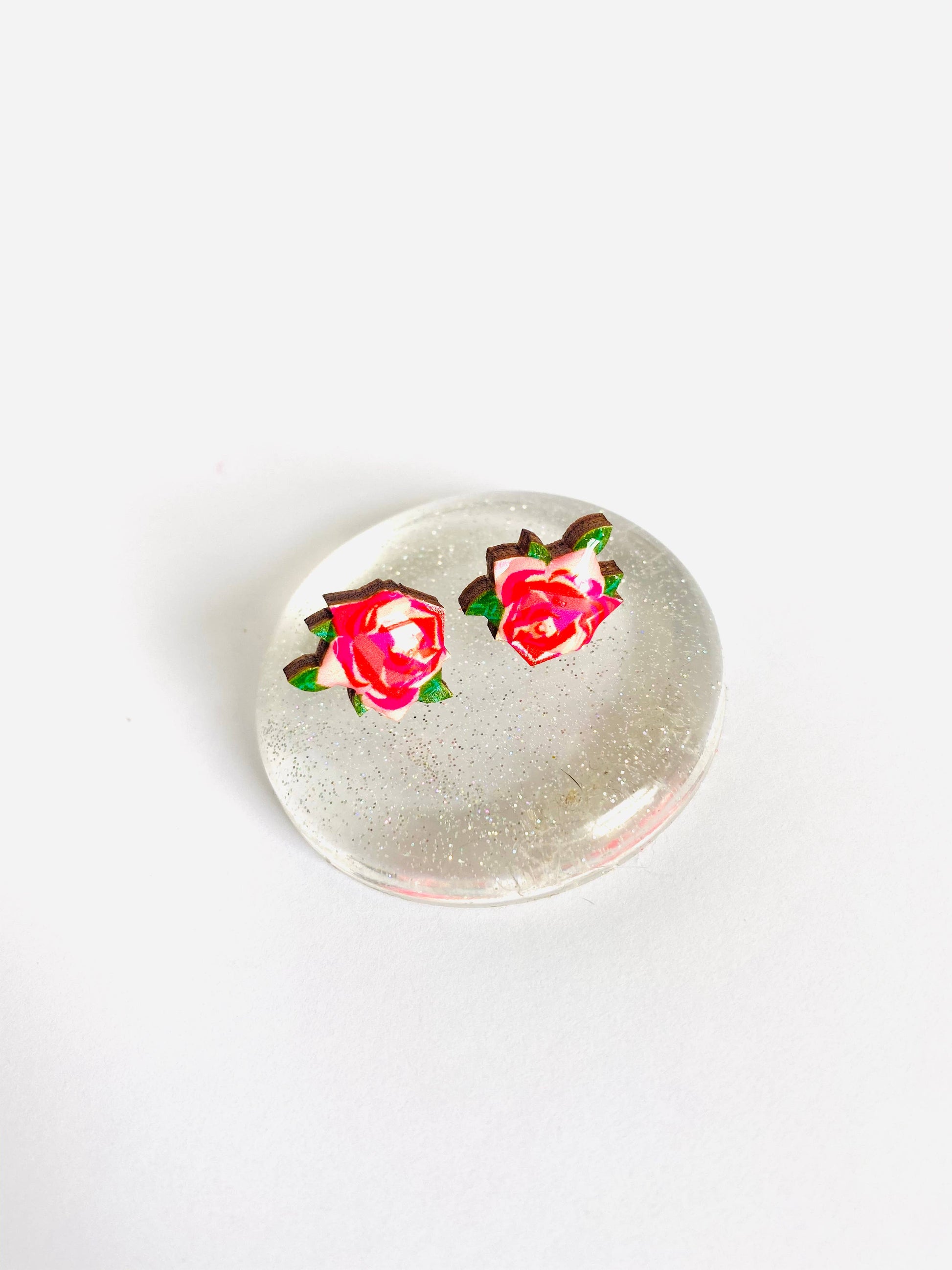 Stunningly pretty small Rose stud earrings illustrated in house by Rosie Rose Parker. These gorgeous hand made earrings are just stunning, so very colourful. Made in a shabby chic theme and finished with hard resin to create a glass affect.