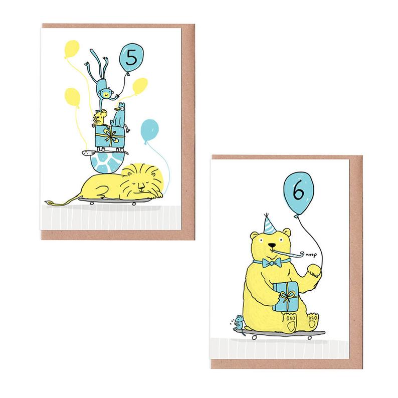 A range of fun children's birthday cards ages 1-6 featuring a lion and his friends. Printed in the UK onto fsc certified 280gsm card. Blank on the inside for your own message. Please note: Cards are posted naked with no cello bag to try to reduce plastic use. Card measure 105mm x 150mm