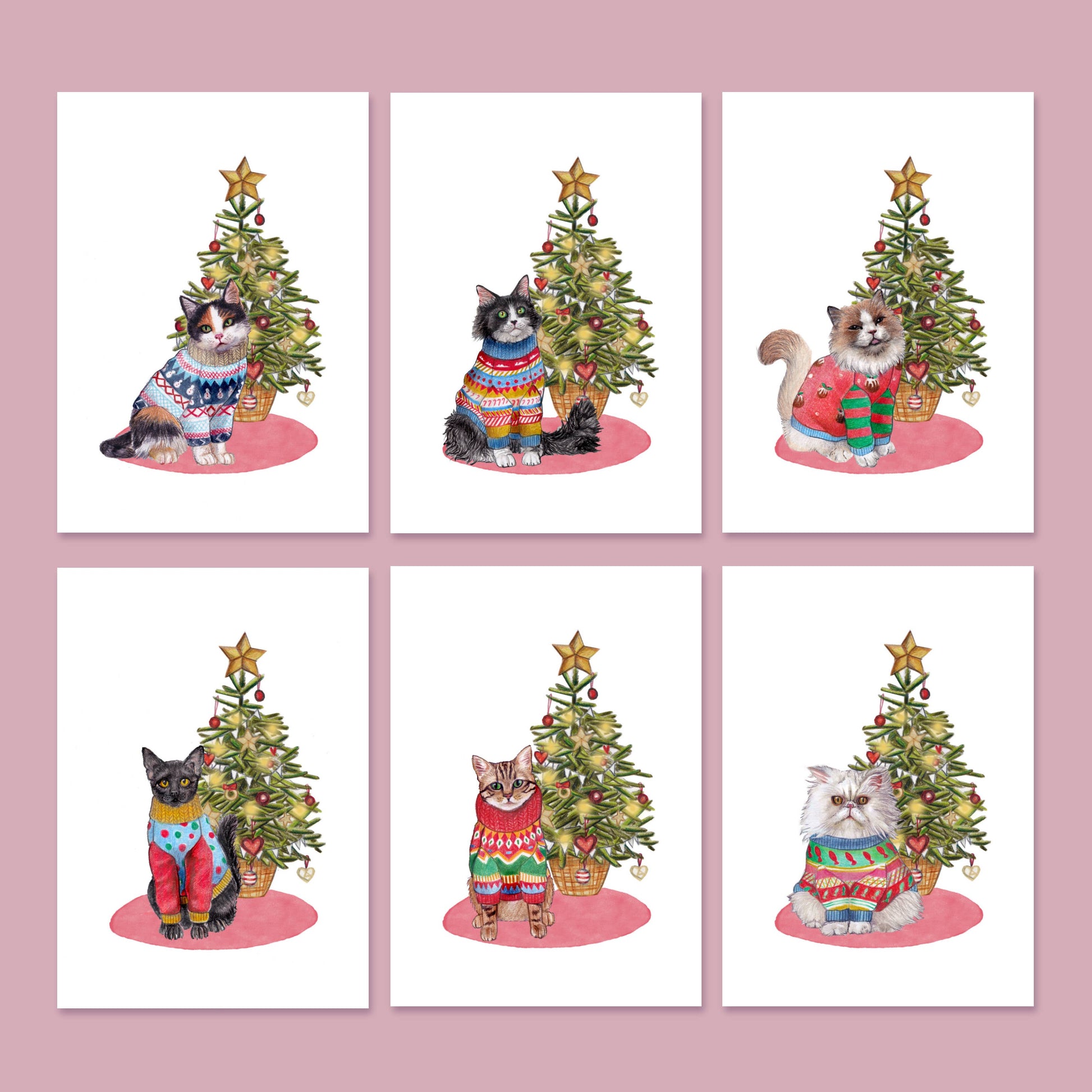 A set of 6 whimsical Cat Christmas cards, featuring 6 hand drawn Cats, sitting infront of Christmas trees. A perfect way to spread some cosy Christmas cheer.
