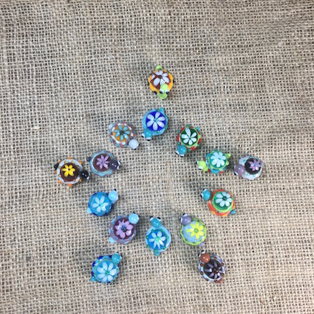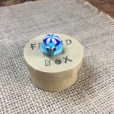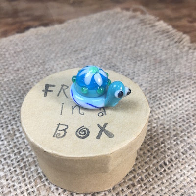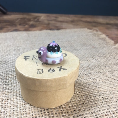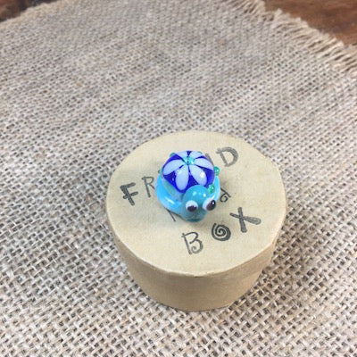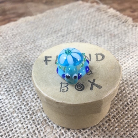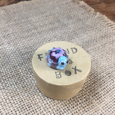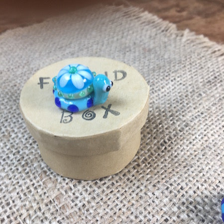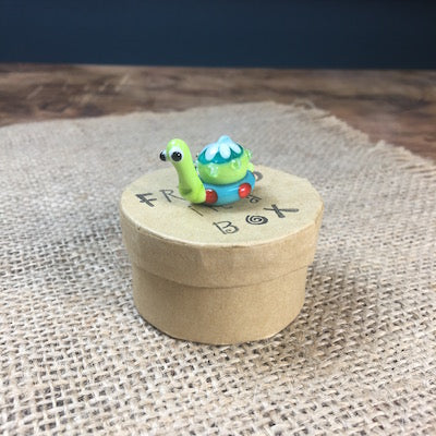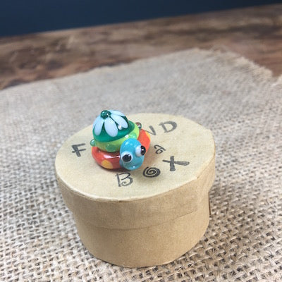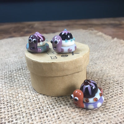 These colourful glass Snurtles are a cross between a Turtle and a Snail. Suitable for Children from the age of 4. Handmade they may vary in colour, shape and expression. They come in their own little box with a sawdust bed. Size 2 cm x 2cm. Handmade in Bristol.