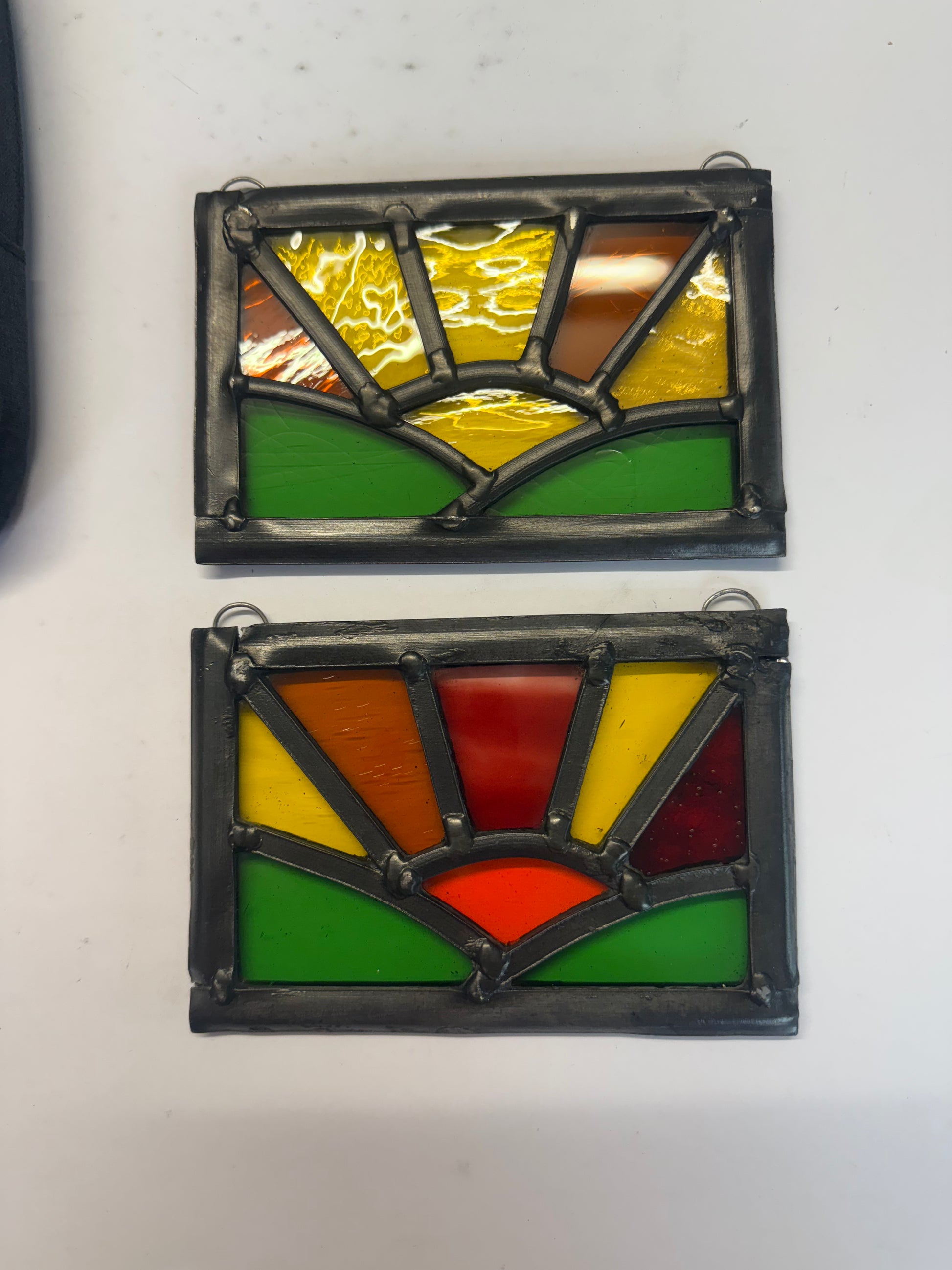 These small suncatchers are inspired by the Art Deco Sunset windows. Made in the traditional method of stained glass window building.