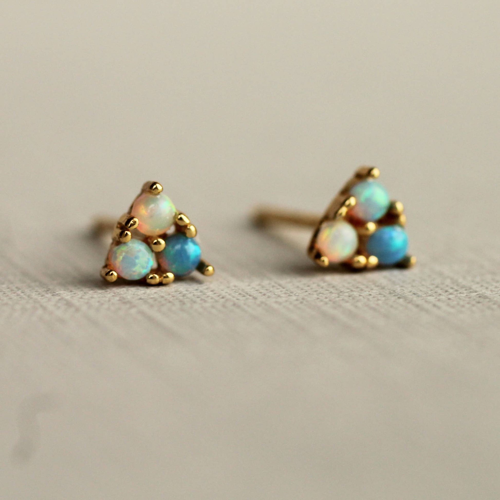 These tiny, delicate opal stud earrings are made of three opals, each a slightly different shade, set in gold plated silver. They have an amazing glowing quality and when they catch the light, flecks of gold and turquoise light up from within. They are really beautiful and unusual.