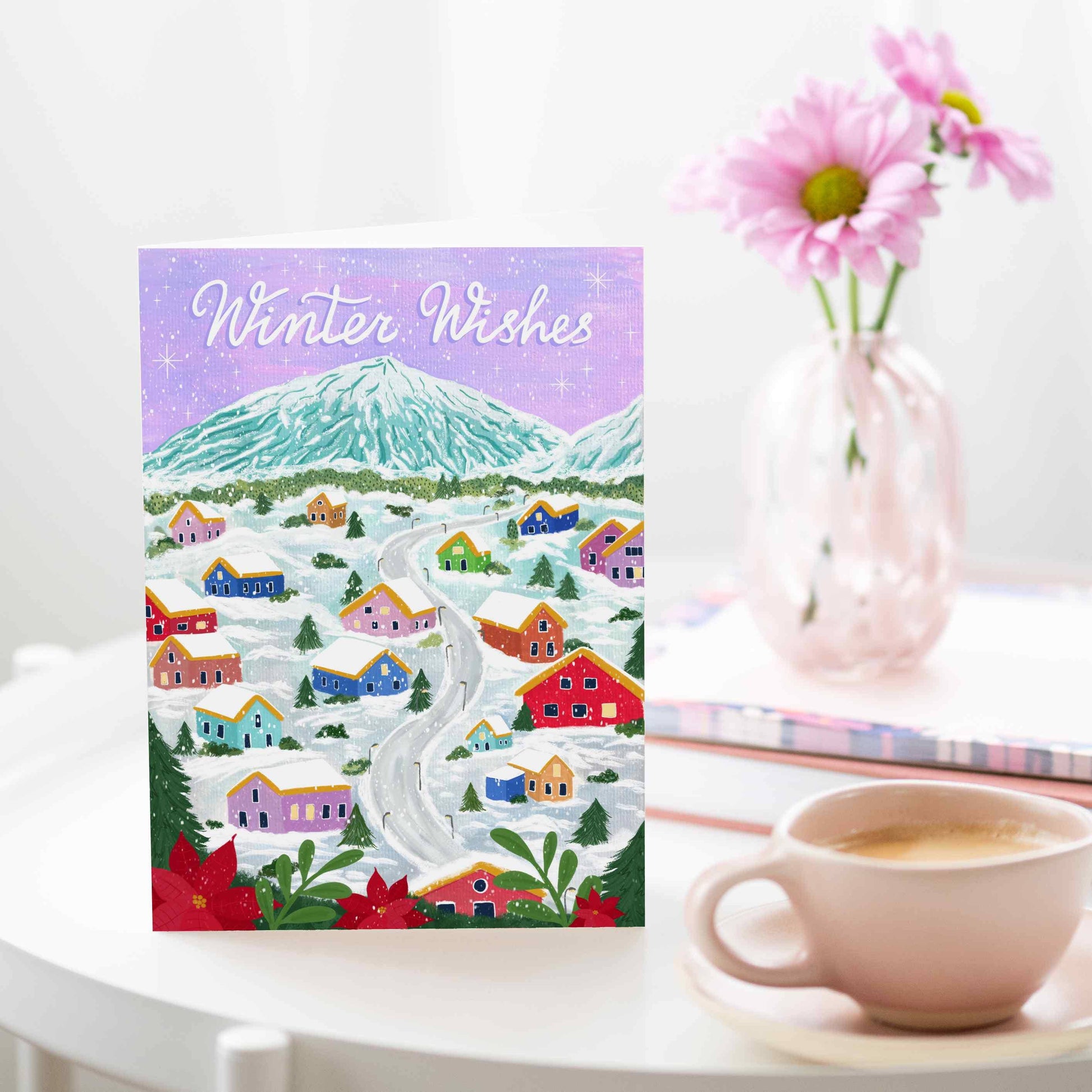 Celebrate the chilliest of all seasons with this winter village holiday card from Gabi and Gaby. The holiday card features an illustration of a colourful mountainside town that is blanketed with thick, fluffy snow and a cursive caption that reads “Winter Wishes”.